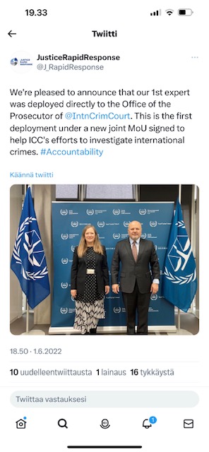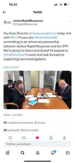 Työn tärkeys nousi uutisiin tällä viikolla kun Kansainvälinen sotarikostuomioistuin esitti pidätysmääräykset Venäjän presidentistä johtuen tämän roolista sotarikoksissa Ukrainassa, erityisesti lasten karkotuksissa Venäjälle sekä siviileihin kohdistuvissa rikoksissa. Tapasin vuosi sitten sotarikostuomioistuimen syyttäjän Karim Khanin joka johtaa syytekäsittelyjä, tuolloin sovimme asiantuntijatuesta juuri lapsiin kohdistuvien rikosten tutkinnassa. Tämä työ kantaa nyt hedelmää. Alla kuvat tuosta tapaamisestani.